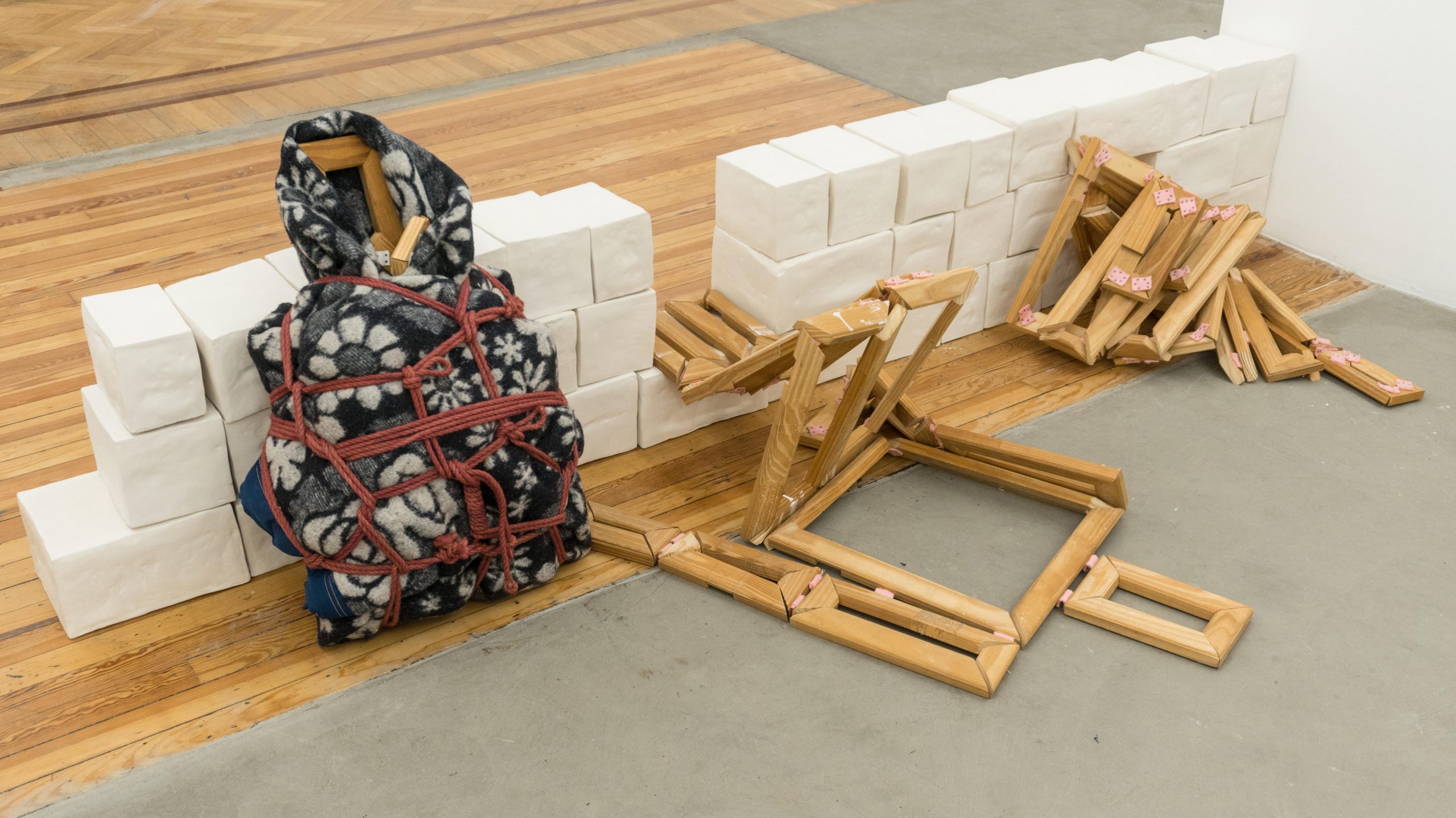 Mariela Scafati, Untitled, 2019, Ceramics, wood, rope, blanket, variable measures. Collection of Benedicta M Badia-Nordenstahl.