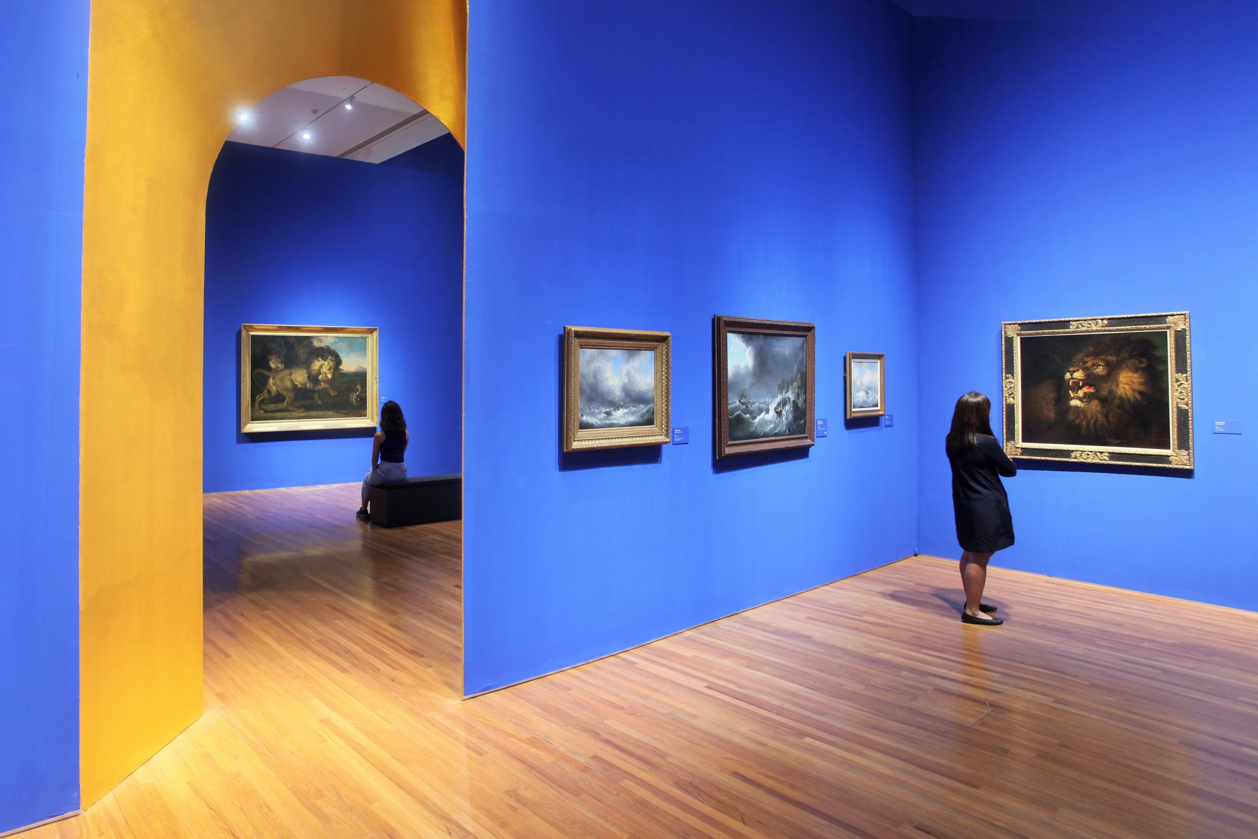 Exhibition view of Between Worlds: Raden Saleh and Juan Luna (16 November 2017–11 March 2018, National Gallery Singapore); Raden Saleh, Two Lions and a Snake in front of a Grotto, 1839, Oil on canvas, 175 x 212 cm, Collection of Museum Lippo; Raden Saleh, Shipwreck in Storm, 1839, Oil on canvas, 40 x 50 cm, Gift of David Salman and Walter Jared Frost, Collection of National Gallery Singapore; Raden Saleh, Kapal Dilanda Badai (Shipwreck in Storm), c. 1837, Oil on canvas, 74 x 97 cm, Collection of National Gallery of Indonesia; Raden Saleh, Ship in Distress, c. 1842, Oil on canvas laid down on board, 38 x 44 cm, Collection of National Gallery Singapore; Raden Saleh, Lion Showing its Teeth, 1838, Oil on canvas, 88.5 x 108 cm, Private collection; Image courtesy of National Gallery Singapore