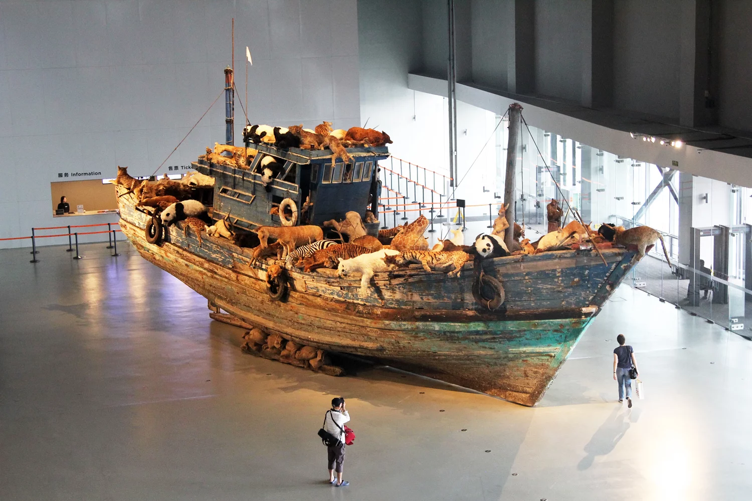 “In ancient times,” Cai said in an interview with The Guardian, “people were more respectful of the environment. The problems we have now are a symptom of the times where people… are exploiting nature’s resources to make money for their own means.” The Ninth Wave, a dilapidated fishing vessel laden with sculptures of endangered animals, was meant to highlight the precarity of a natural world left to the mercy of man and industry. It sailed down the Huangpu River, Shanghai, in front of massive crowds, before landing at the Power Station of Art. Brash and unapologetic, the work was urgent and uncompromising, expressing the artist’s horror of the state which the natural world is now in.