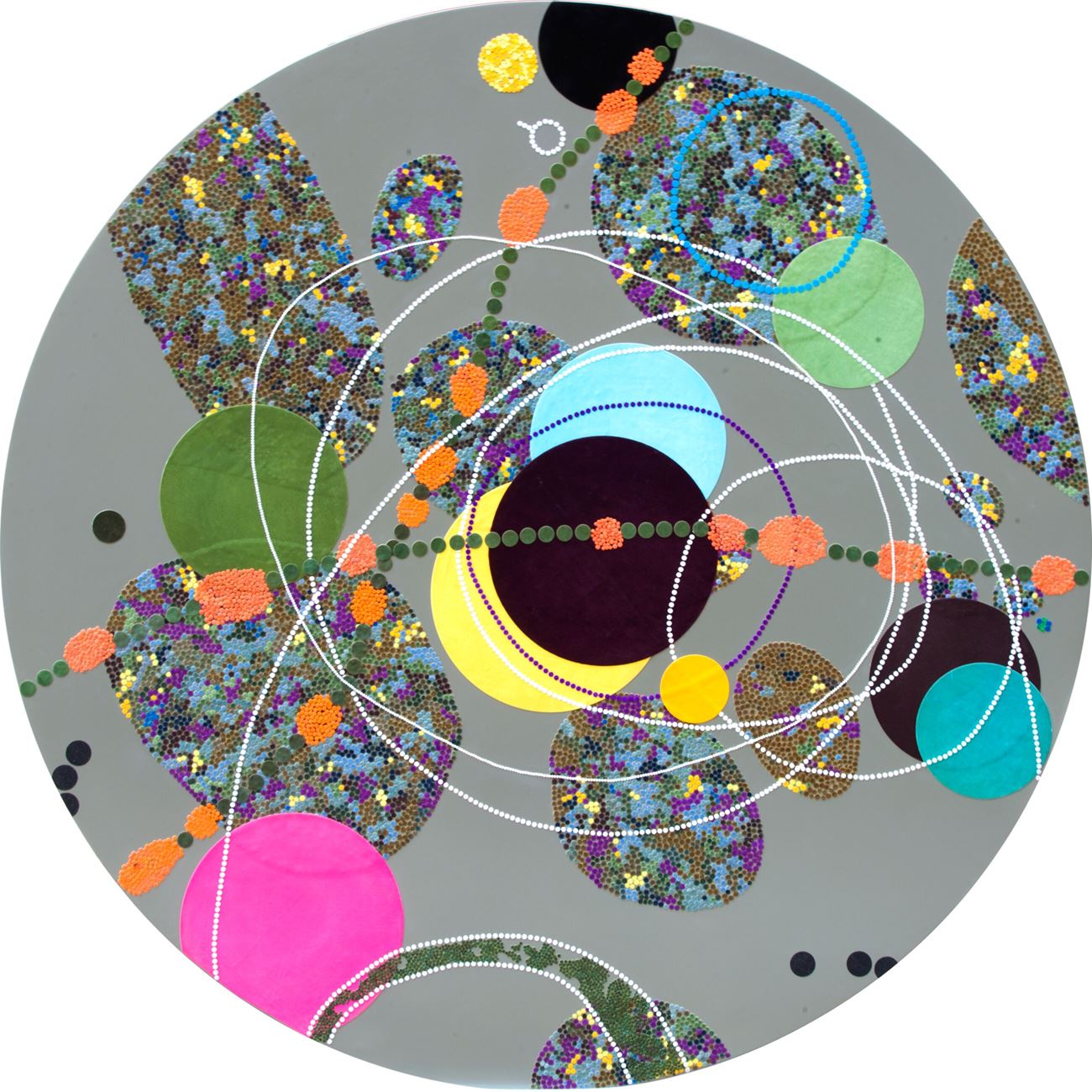 Algorithm for time travel, Bharti Kher, 2018, bindis on painted board, diameter: 157.48 cm. Image courtesy the artist and Hauser & Wirth.