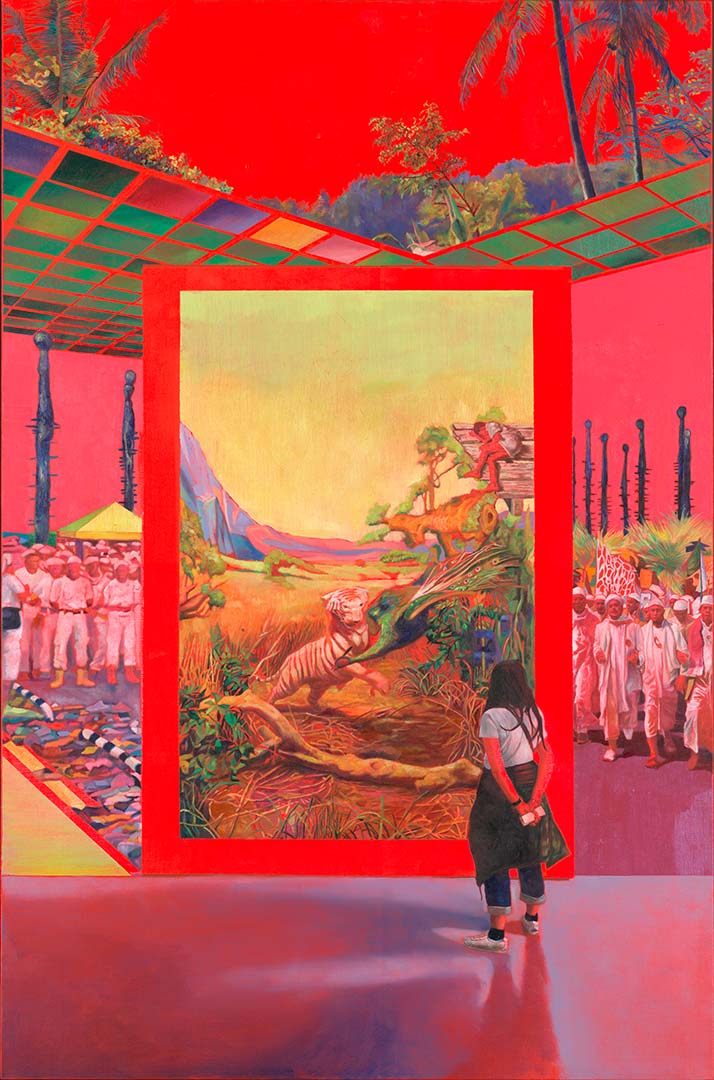 Albaiquni’s work often seeks to subvert the Mooi Indie (beautiful Indies) genre of painting, which expressed romanticised scenes of Indonesian life under Dutch colonial rule. Albaiquni’s intriguing palettes and manipulations of perspective culminates in a body of work that causes viewers to pause and ruminate, leaving them with questions that linger long afterwards.