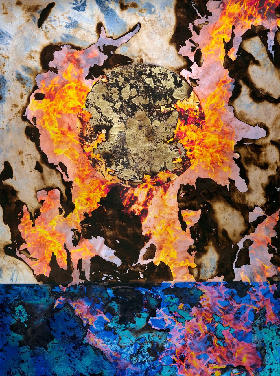 “When something burns,” Arunanondchai has said, “it becomes something else.” Central to this painting is an encompassing flame, with fire being a material that has long interested the artist. The painting is suffused with the sense of rupture that allows for transformation, and is inspired by Thailand’s student protestors.