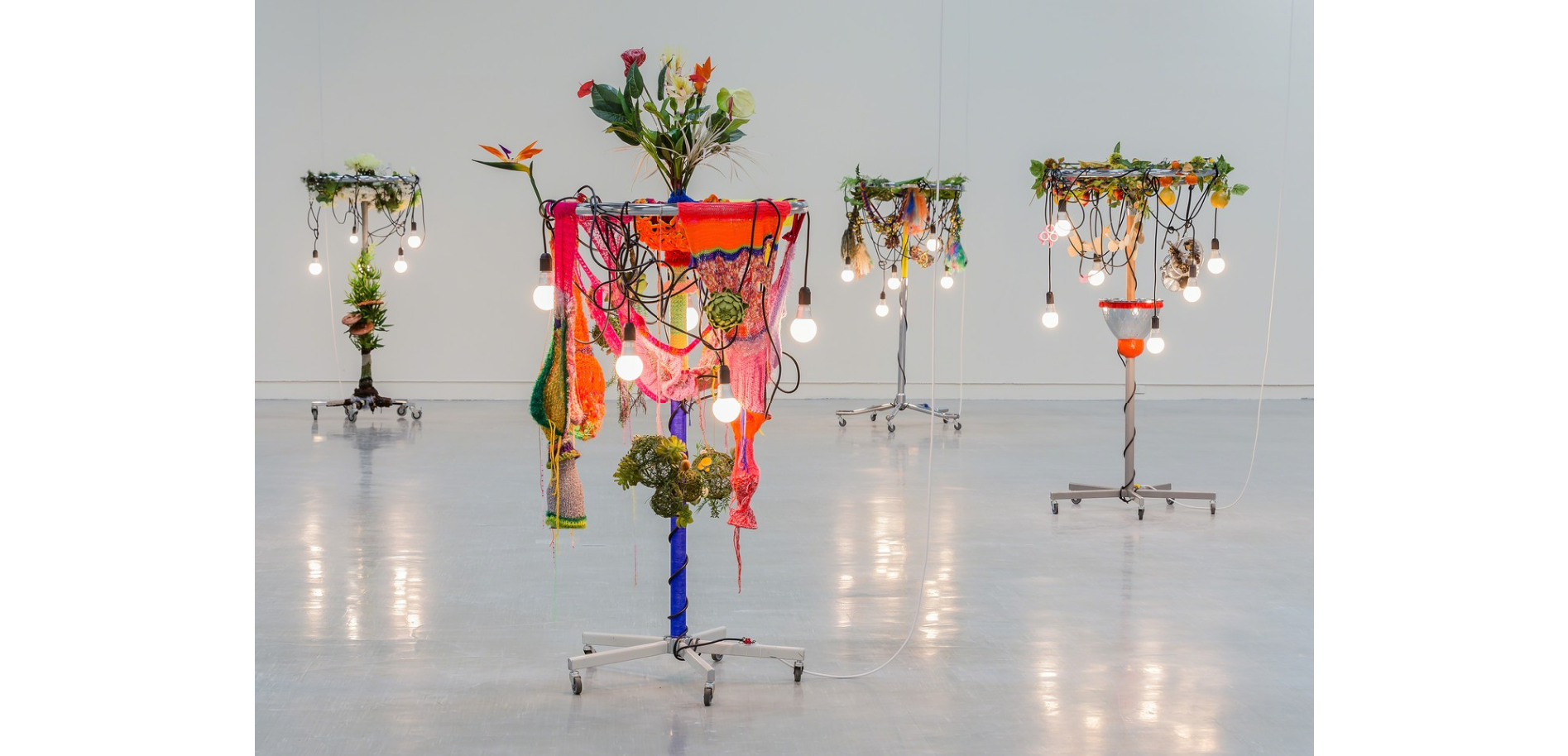 Haegue Yang, 2010, Female Natives: No. 3 Saturation out of Season, 2010, clothing rack, light bulbs, cable, artificial plants, yarn, cord, metal ring, metal chain, aluminum reflector, dimensions variable. Image courtesy Artsy.