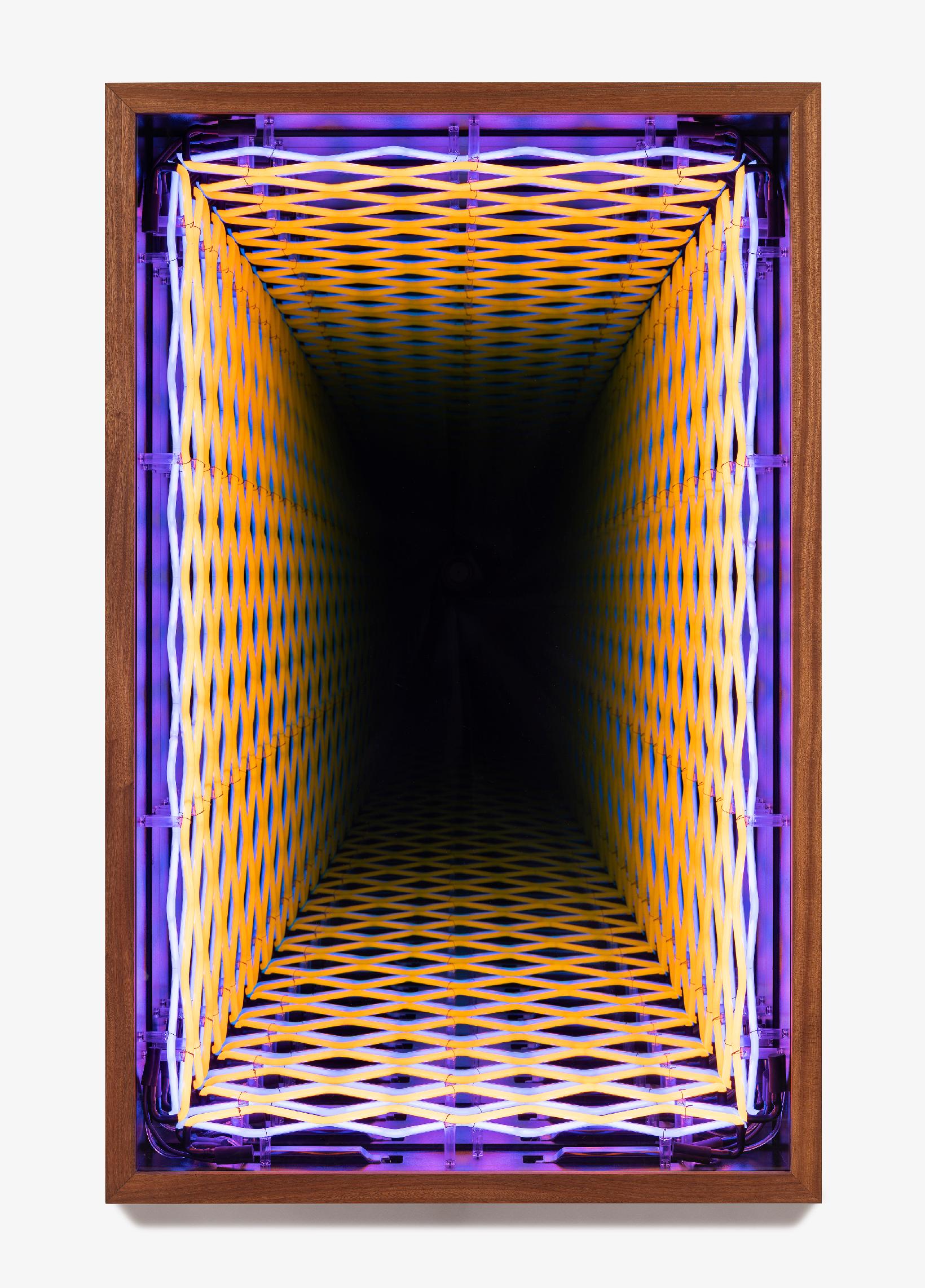 Neon light, sapele, mirror, one-way mirror and electric energy