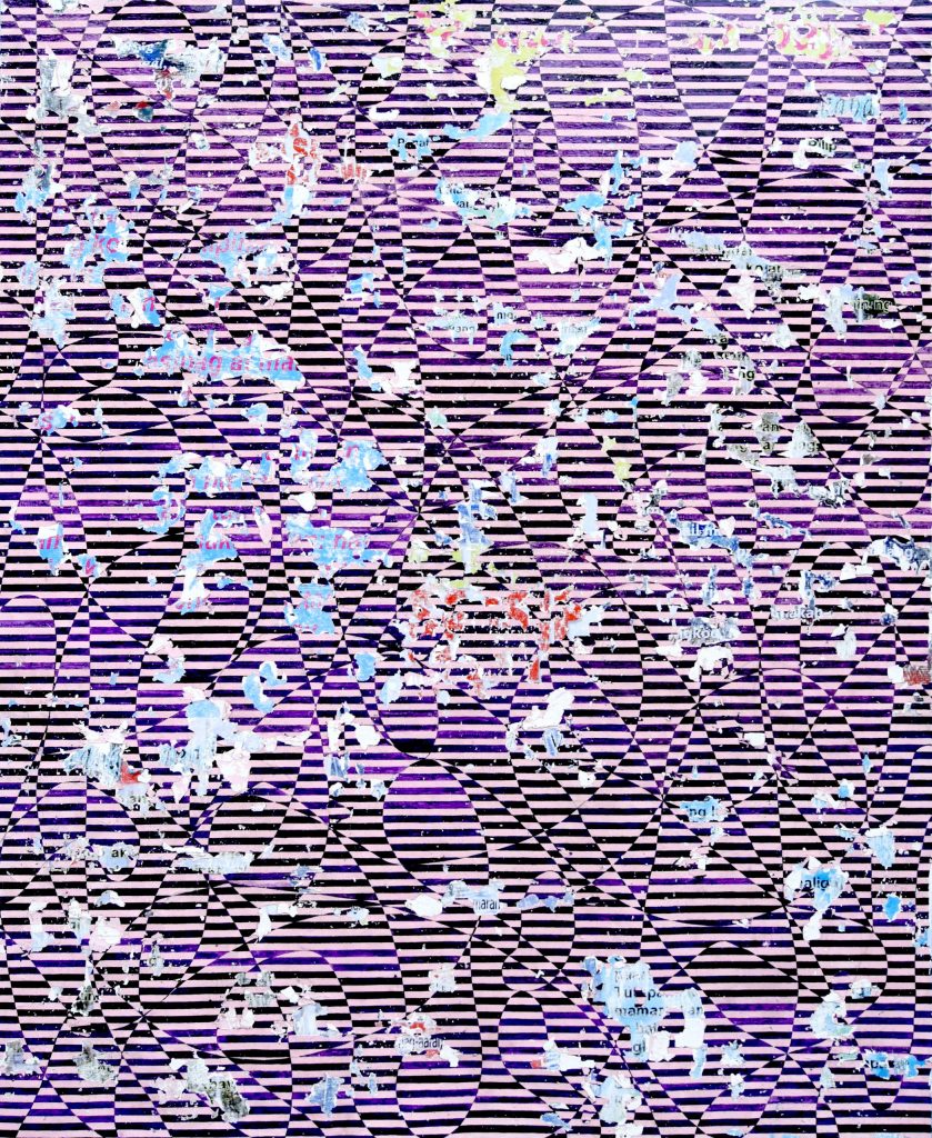 Kristoffer Ardeña’s Ghost Paintings are often a visual feast of illusory patterns and mesmeric colours, while the textual and material subject matter beneath remains partially obscured. Upon a closer look, his work reflects the tropical conditions of his local surroundings in Negros Island, and is a testament to the ubiquity of materials like tarpaulin, the local katrina fabric, or the basahan rugs all throughout the Philippines. Ardeña paints with elastomeric paint, an anti-humidity industrial paint often used in the tropics, and the resulting canvases are a vivid celebration of equatorial material culture.