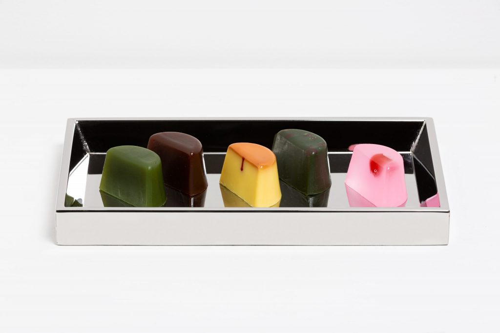 Most of us know that Rirkrit Tiravanija’s relational aesthetics more famously revolve around cooking and communal eating, pointing to human interactions and rituals as art just as much as whatever objects hang on the walls of a gallery. This time, Tiravanija designs five halves of plastic sweets with their glossy surfaces looking so “fake” that their varnish reinforces them as mere objects. They sit atop a reflective platter, and in it we see ourselves peering over the vitrine, just looking — and not touching — or eating — Tiravanija’s food.