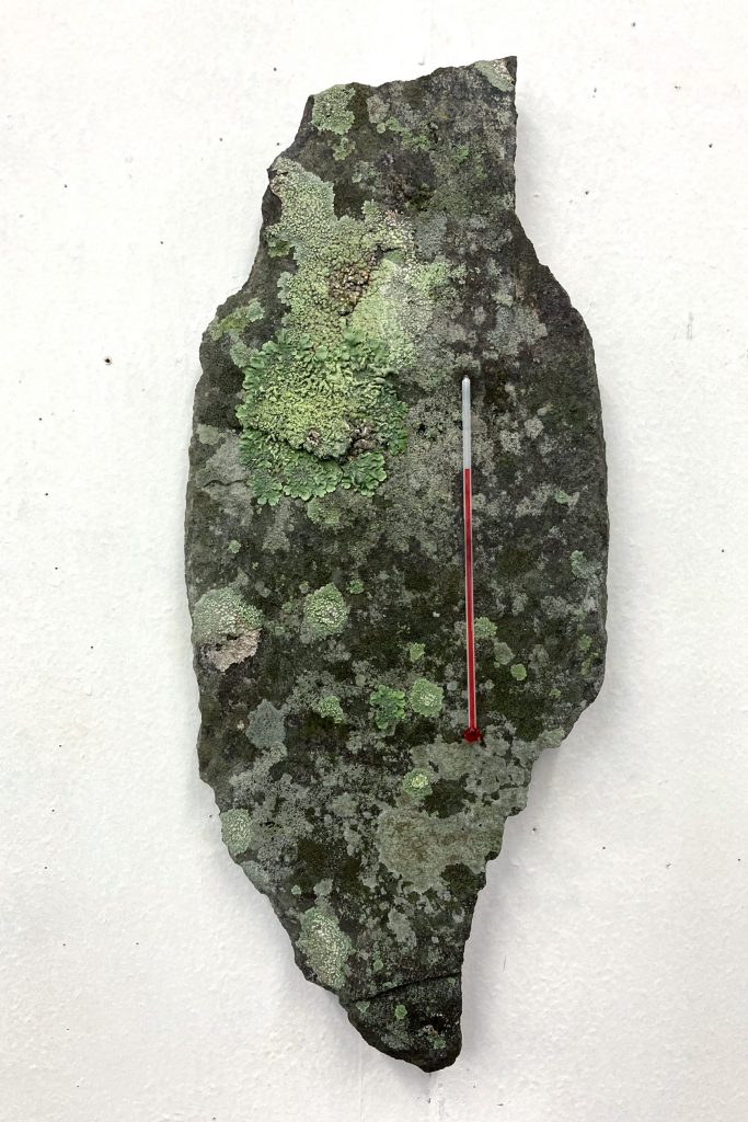 While Syaiful Garibaldi’s large paintings depict harmonious colour washes that stylise scientific observations of microorganisms, although small, this lichen-covered rock that hung amongst them aptly substantiates the artist’s fascination for ecology. In fusing art and science with a simple gesture (the addition of the thermometer), Garibaldi draws attention to the observer’s inability to categorise, measure or differentiate between interconnected organisms. The living symbiosis of fungi and algae proliferates so that an entire universe breathes and radiates over the exterior of the rock.