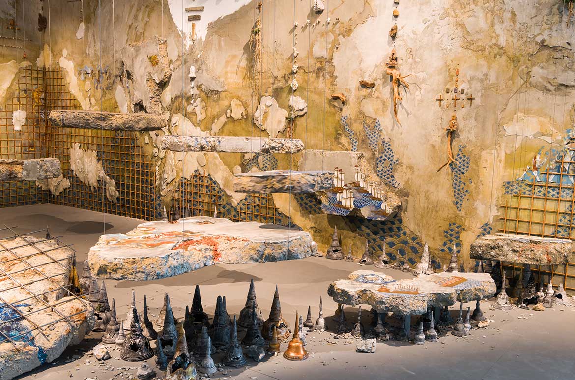 Pannaphan Yodmanee, ‘In the aftermath’ (and details), 2018, Found objects, artist-made icons, plaster, resin, concrete, steel, pigment, site-specific installation, Gallery of Modern Art (GOMA), commissioned for ‘The 9th Asia Pacific Triennial of Contemporary Art’ (APT9). Image courtesy of QAGOMA and Yavuz Gallery, Singapore.