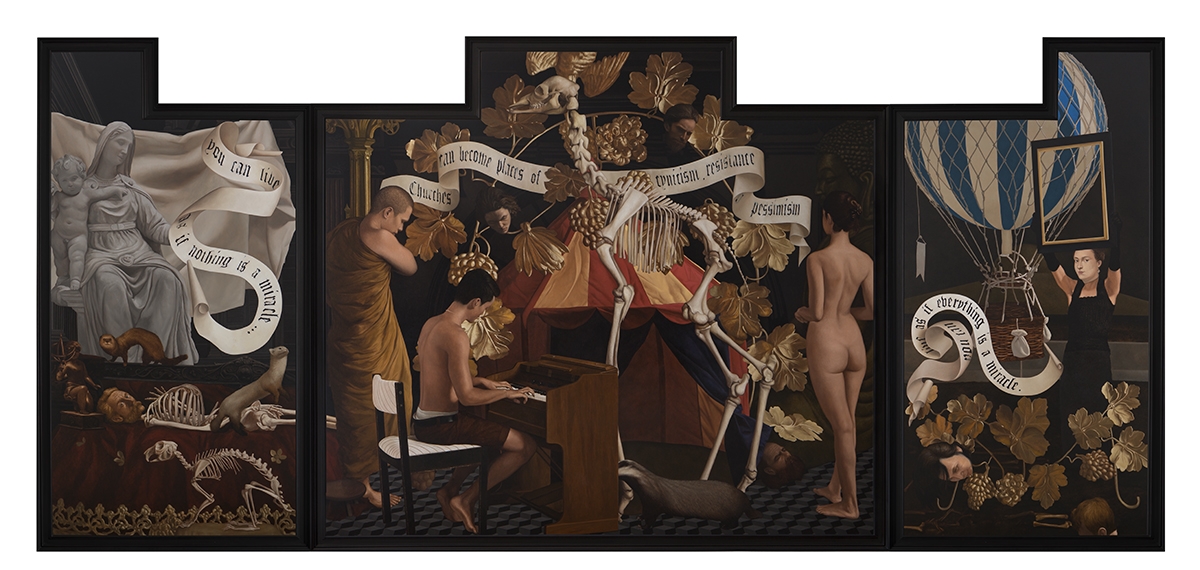 Natee Utarit, ‘Theatre of the Absurd’, 2015, oil on canvas, triptych, 250 x 540 cm. Image courtesy of Richard Koh Fine Art and Asia Society.