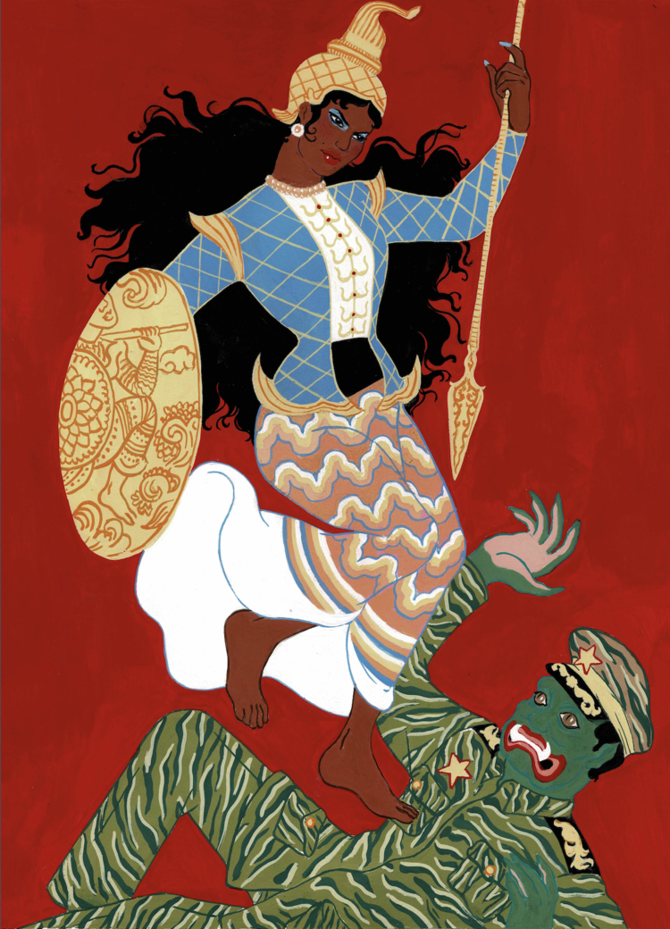 Richie Htet is becoming an increasingly familiar name within the regional contemporary art scene. He has been included in group exhibitions that took place at the NTU ADM Gallery and Richard Koh Fine Art, both in Singapore. His first solo took place in the gallery space of Myanm/art in 2020, titled ‘A Chauk: A Solo Exhibition’. Stemming from personal experiences of being called ‘a chauk’ — a derogatory Burmese term used towards those identifying as LGBTQI+ — Htet’s practice reclaims the label and deems it powerless, turning to eroticised folklore and epics of Nat spirits to question binary thinking and constructs of identity. Most recently, Htet’s response to the ongoing military coup is also depicted with similar motifs, centering queer representation in the fight for revolution. Originally trained in Fashion Illustration, he pays particular attention to the details and patterns of fabric, make-up, and vivid colours throughout his paintings.