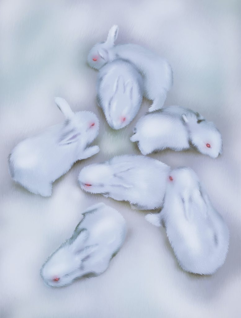 The works of Swiss artist Gagliardi (b. 1989) are vivid and hallucinatory, the “white rabbits” alluded to here an apt reference to the old children’s novel, where Alice enters into a Wonderland where everything appears similar to the “real world” she has left, yet is somehow stranger. The familiar is seen through an otherworldly lens, an effect achieved by the artist’s use of colour and depth, the melding of digital and physical mediums. The result is surreal, mildly disconcerting yet entrancing.